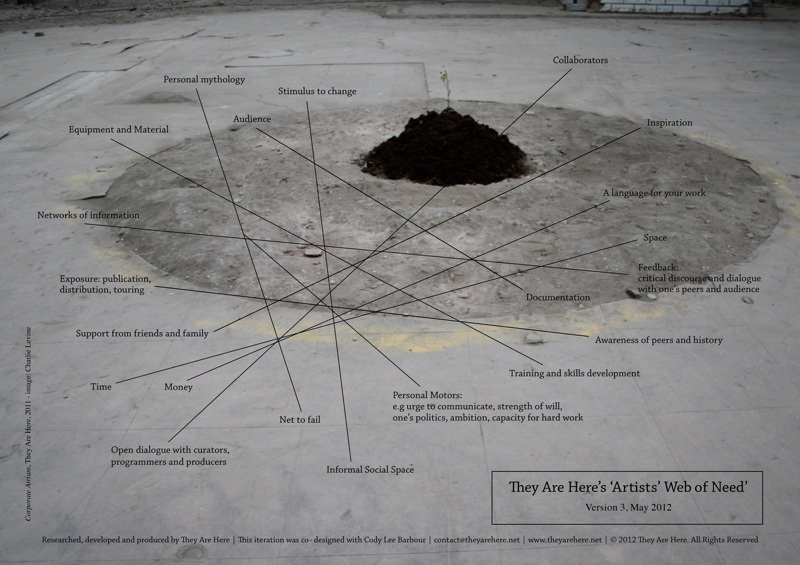 They Are Here’s Artists’ Web of Need can be considered a self-diagnostic tool for artists, groups, organisations and institutions supportive of artists. Inspired by Maslow’s Hierarchy of Needs, TAHAWON is an open and evolving project and dialogue. It has already undergone three iterations since 2011.