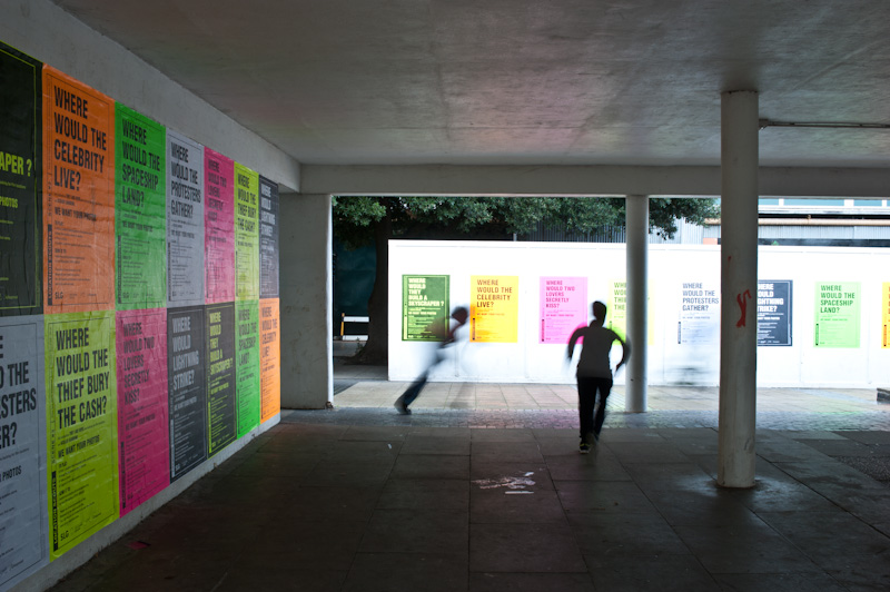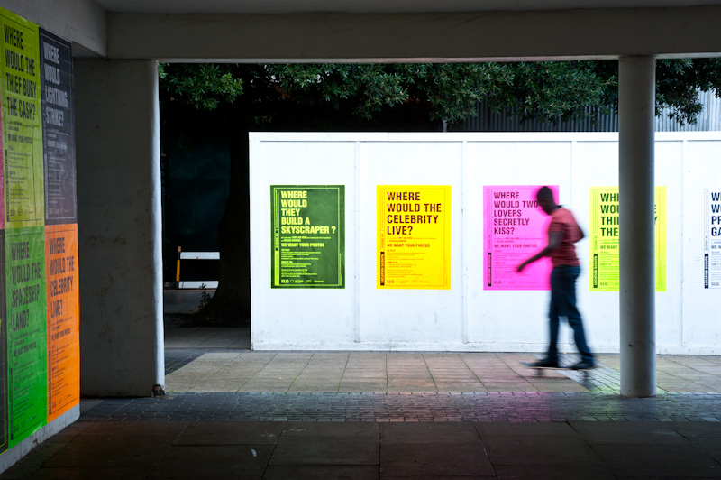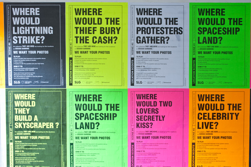 The questions are posed via a series of large fly-posters across the estate, ranging from the everyday to the fantastical. Residents can participate by texting or emailing photographs of different sites which they think could be used for a film scene. At the end of the project, these submissions will be gathered to form a pool of images, enabling players to compare their contribution with others.